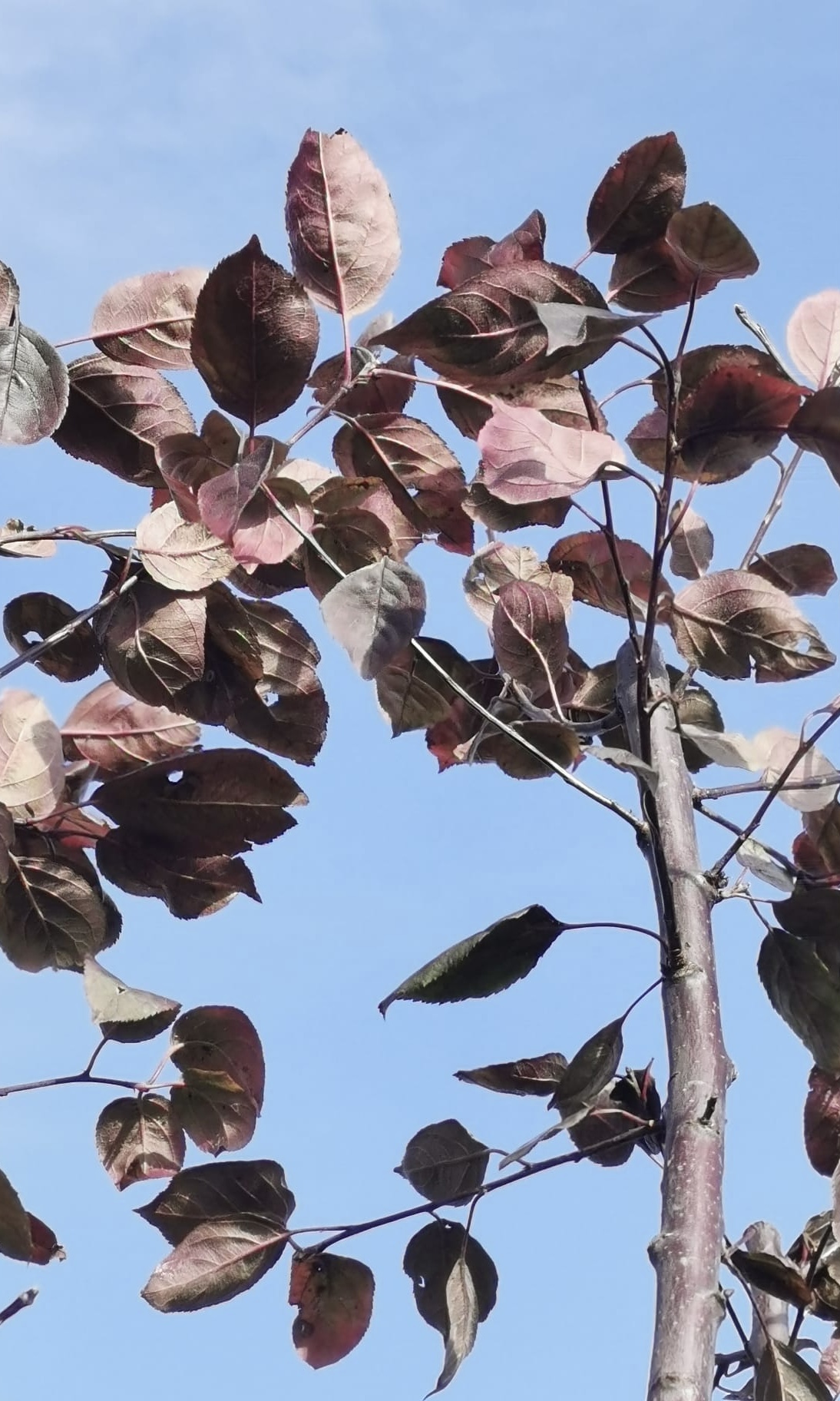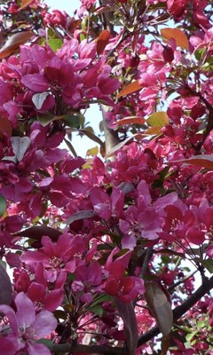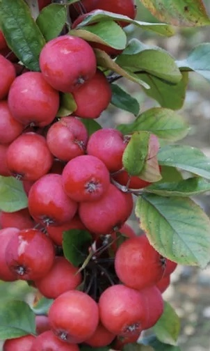 Rode sierappel in struikvorm met rood blad en hardroze bloesem, trekt in de winter veel zangvogels.